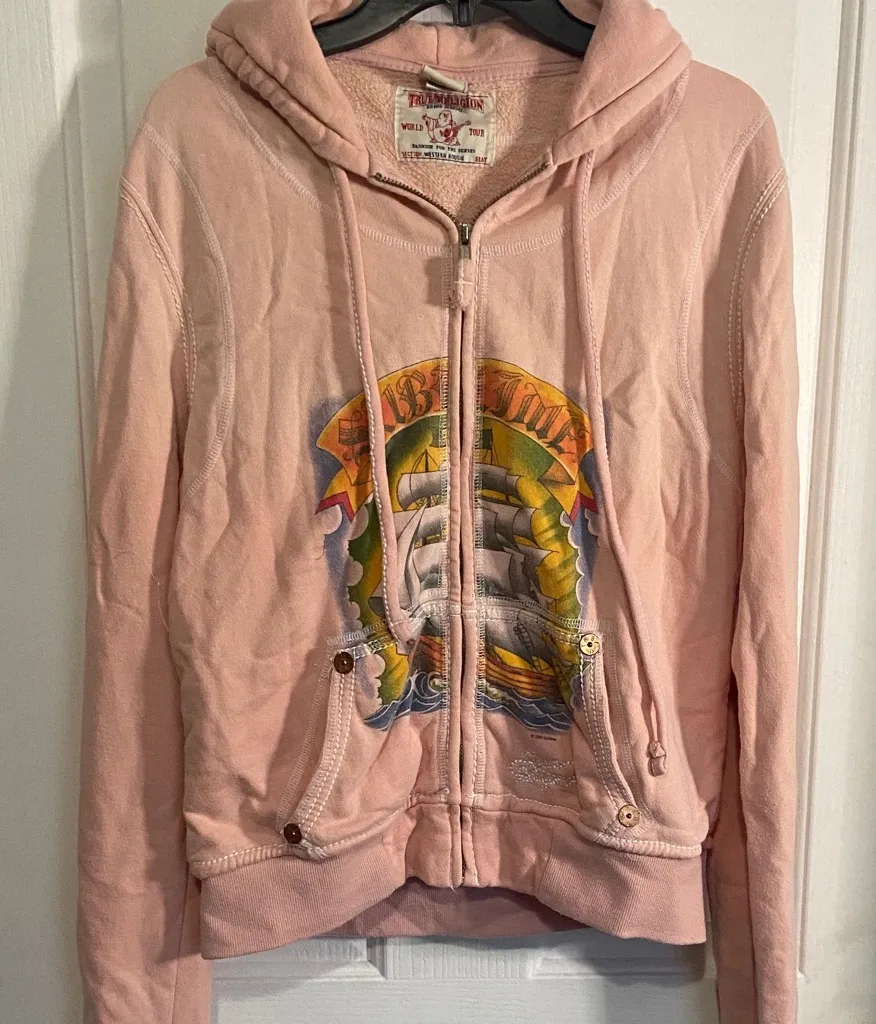 Light pink hoodie with vibrant ship graphic. Features front zipper and pockets. With straight leg sw... Show more