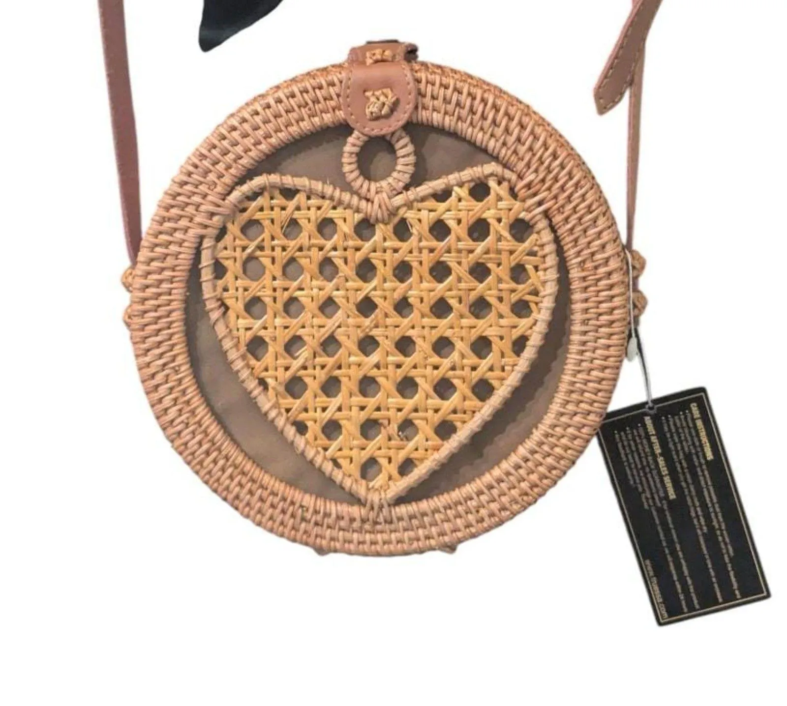 Embrace coastal and bohemian charm with this beautiful round rattan bag from Truessa. The natural hand-woven rattan texture and the unique woven heart detail in the center make this a truly whimsical accessory. The leather-look crossbody strap is adjustable, and the bag is lined for security. This bag isn't just an accessory; it’s a feeling of carefree, summer style, perfect for the beach, a festival, or adding a unique touch to your everyday look. Note: This item is New With Tags (NWT) from the Truessa brand. Highlighted Features: Authentic Truessa brand, NWT Hand-woven round rattan bag Unique woven heart detail in the center Adjustable leather-look crossbody strap Ideal for boho, summer, and resort wear