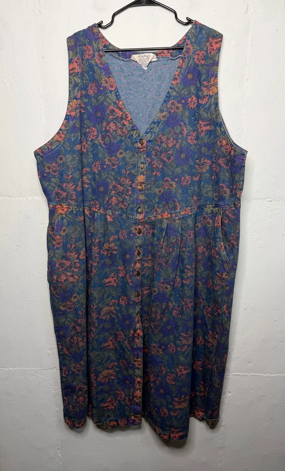 Truly Yours Vintage 90s 3X Denim Button Down Dress Sleeveless Floral Flowers Blue - $60 - From ThriftyKat