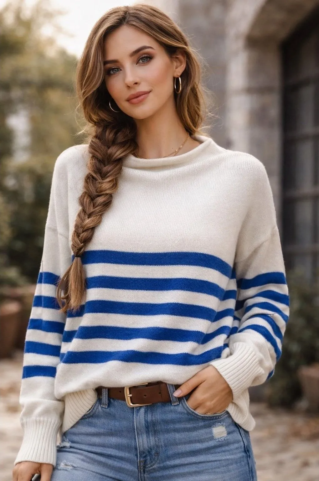Cream knit sweater with blue stripe detailing by Truth by Republic. Features a soft knit texture, re... Show more