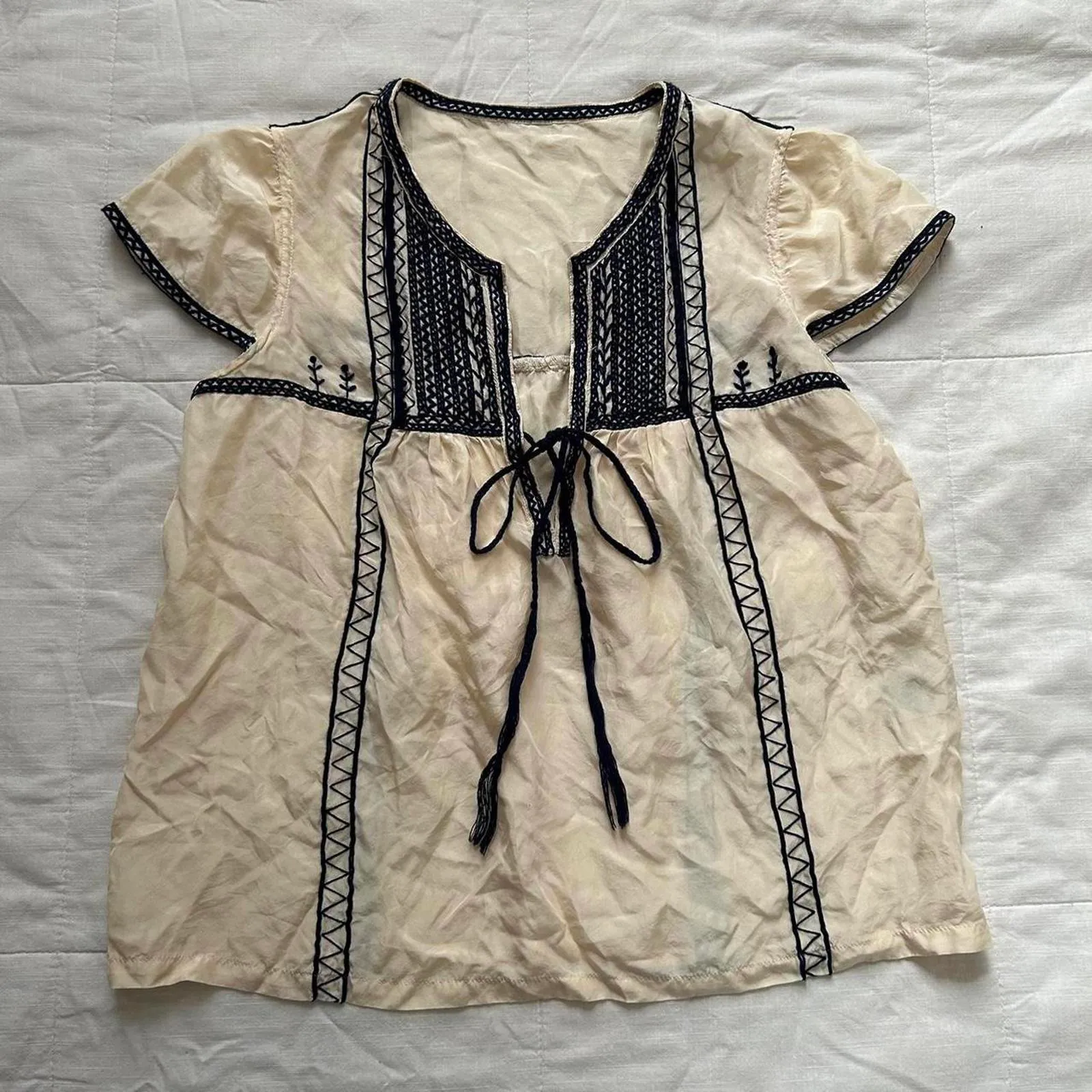 Tsumori Chisato Cream silk and black embroidery boho peasant blouse Size 2 - $65 - From Killah