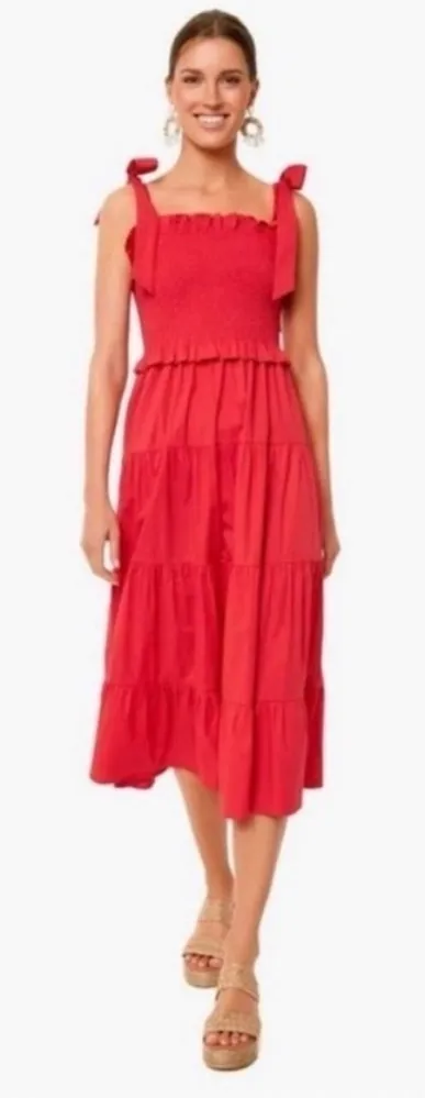 Tuckernuck Alannah Tiered Midi Dress Bow Straps Smocked Ruffles Red Features: • Tiered skirt • Tie... Show more
