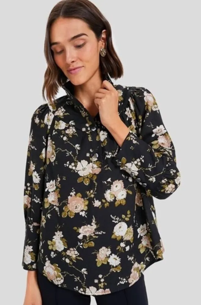 Floral print long sleeve blouse from Tuckernuck Features a stand collar, partial button front placke... Show more