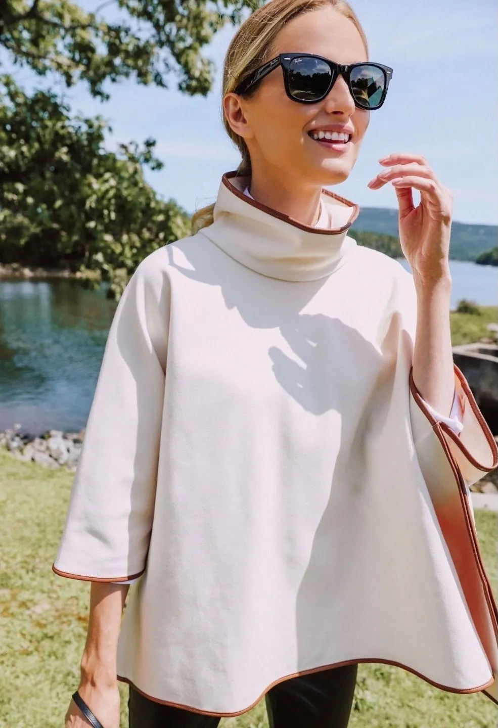 One size fits most New without tags Ivory cream with brown leather trim I am always open to fair offers! I also offer discounts for bundling more than one item. Feel free to reach out with any additional questions. Keywords: Neutral, oversized, quiet luxury, Old money, minimalist, preppy, coastal, spring, layer, Lagenlook, Scandi