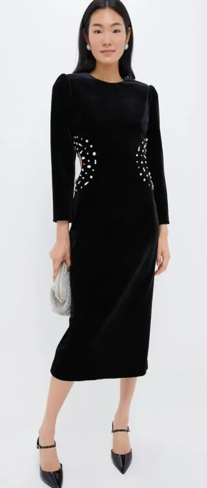 Tuckernuck Hyacinth House Jules Velvet Midi Dress – Women’s Size M 🏷️ Retail: $198 💎 Condition: Excellent! 📏 Measurements (flat lay): 50"L,18" armpit x armpit, 14" waist (flat)--approximate, hard to measure with cutouts (Compare to your favorite piece for best fit.) 🧵 Material: 92% Polyester, 8% Spandex (outer), 100% Polyester (lining) 🧺 Care: Hand wash ✨ Description: The Jules Midi Dress is a sophisticated pencil silhouette with eye-catching bejeweled cutouts on either side. The subtle puffed shoulders and luxe velvet fabric make this the ultimate look for special occasions- just add silver earrings, heels, and a clutch! Puffed shoulders Back zip closure Side cut-outs with jewel embellishments Back slit Lined 🛍️ Bundle 2+ items to save — discount auto-applied! ✨ Follow my closet for daily new listings and markdowns! 🚚 Fast Shipping ,Velvet midi dress, event dress, cocktail dress, modern eveningwear, luxe velvet dress, side cut-out dress, Christmas, Holiday, NYE