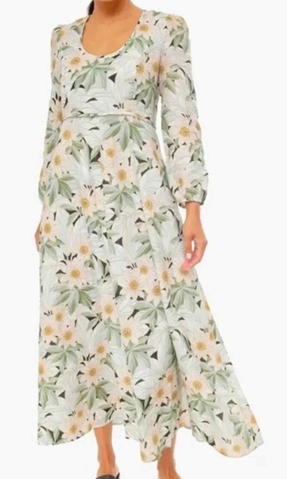 Brand new condition with tags - new & never worn Retails for $248 Embrace spring in style with this Tuckernuck maxi dress. Featuring a classic silhouette with gorgeous ivory and green floral print, and pockets. Made with a linen and cotton blend, this piece would pair well with booties or sandals for the perfect warm weather look. Blogger favorite - seen around town! Long sleeves Scoop neckline Lined skirt Back hidden zipper Side hidden pockets 55% linen / 45% cotton / hand wash Approximate measurements / laid flat / no stretch Bust: 36-37” Natural Waist: 34” Length: 54”