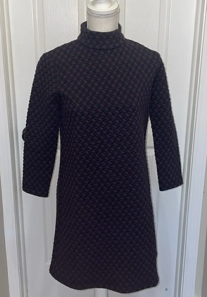 Tuckernuck Navy & Brown Geometric Print Quilted Mock Neck Dress, NWT. Size XS. Care & content tags in photos. 3/4 length sleeves. Fall, autumn, winter, quilted, office, work, warm, cozy, comfy