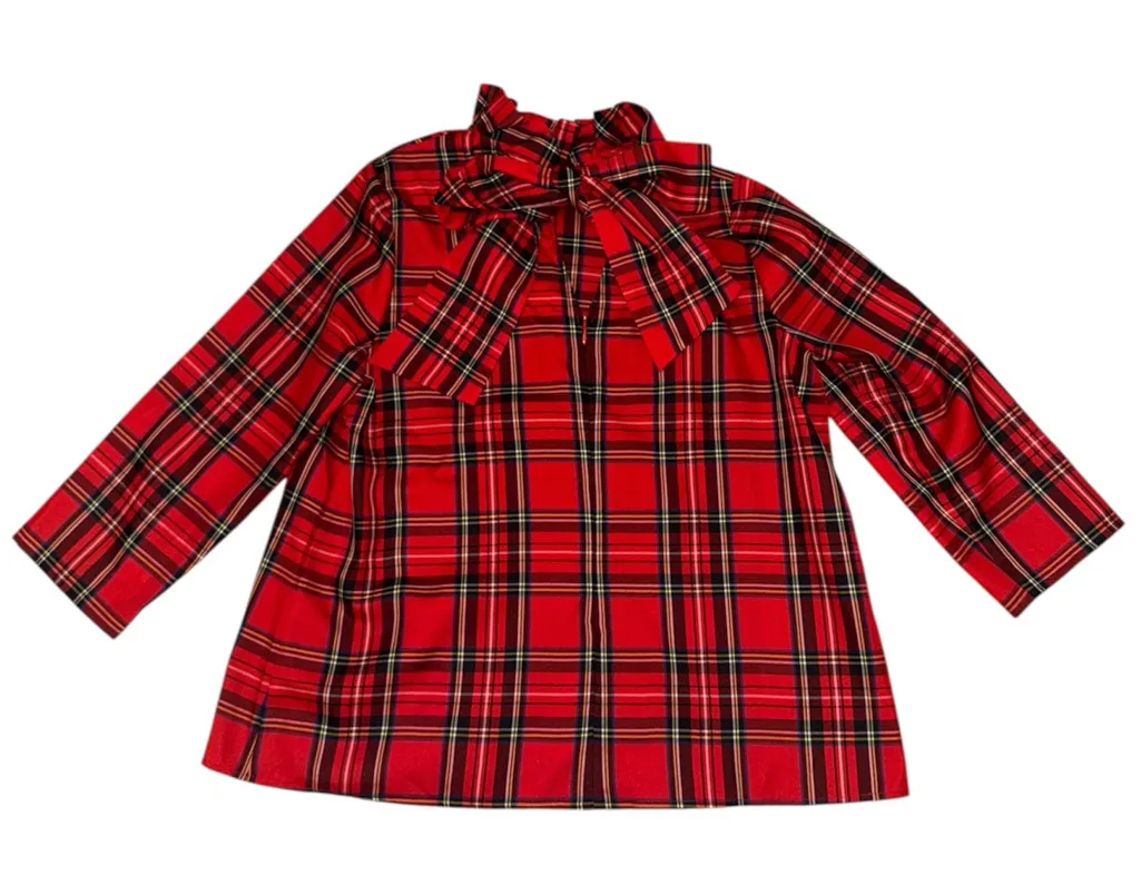 . Blouse is brand new with tags. The big bow is in the back and is adjustable and there is a zipper closure. Made out of 100% polyester and made in China. Measurements are 21 1/2 inches pit to pit x 27 inches length.