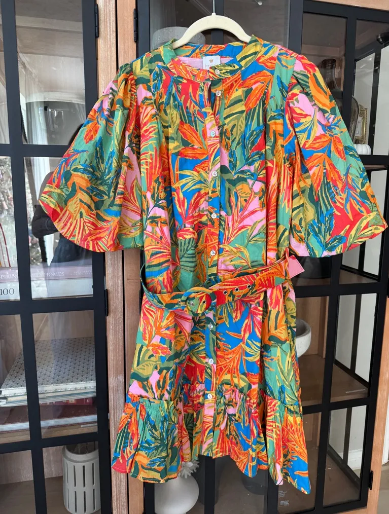 Size medium Excellent condition Adjustable & detachable belted waist Short puff statement sleeves Button down Pockets Farm rio tropical vacation colorful birds of paradise resort wear anthropologie brazil Caribbean cruise