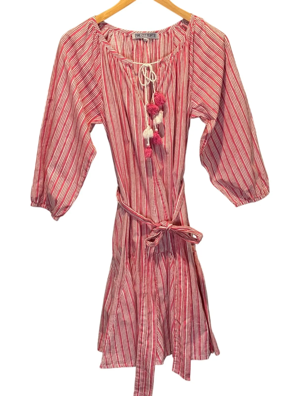 Bracelet length sleeves. V-neck with ties and tassel details. Matching fabric belt. Flared skirt. Hand dyed, unique striped print. 100% cotton. Pre-loved and in good condition. Approximate measurements while laid flat: Length 37in Armpit to armpit 18.5in Waist 21.5in