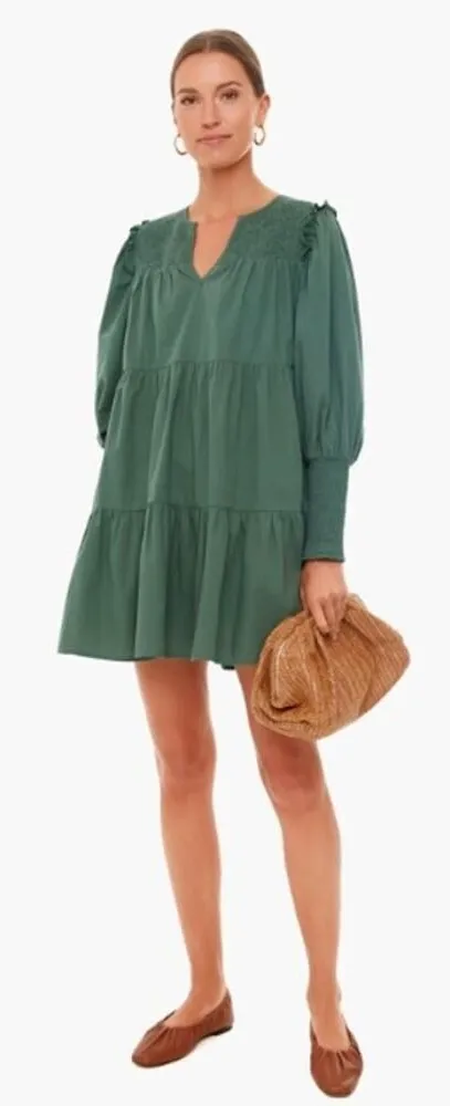 Tuckernuck Pomander Place Ceci Tiered Mini Dress Sz. S Retails $185 Great condition! Note: This dress is muted/faded but that's how it was intended to look---see stock photos Measures: 33-34"L,18" armpit x armpit 100% Cotton Hand Wash The Jaguar Green Ceci features the signature tiered mini silhouette with a new textured neckline detail and ruffle shoulders to round out the feminine and flirty style.