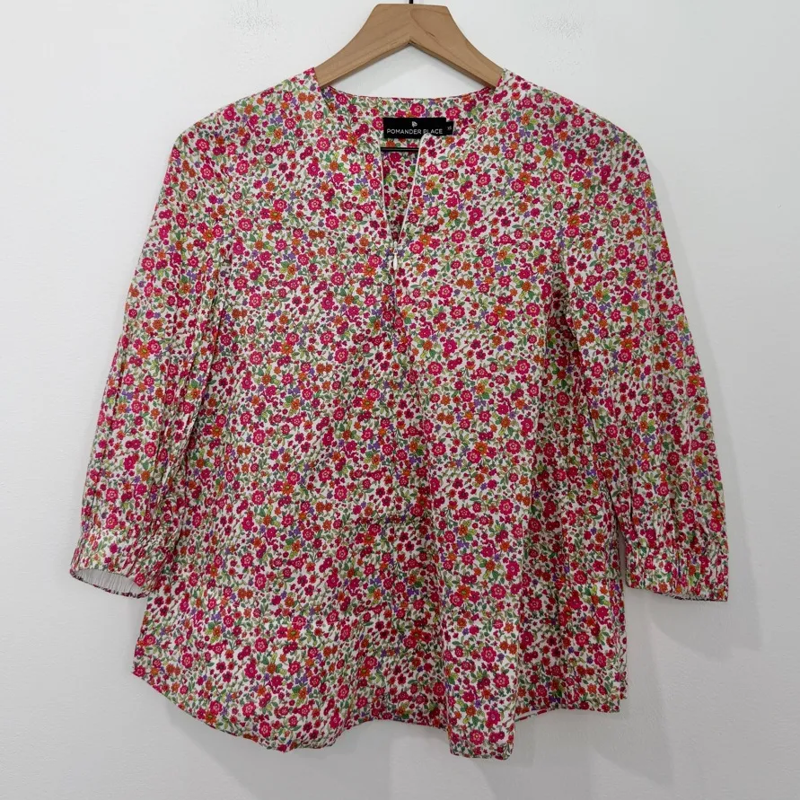 Tuckernuck Pomander Place Kieran Blouse Pink White Floral Cotton Zip Top Size: XS A wardrobe classic, the Pomander Place Kieran Blouse features scrunched three-quarter sleeves and a zip-up neckline. Light enough to be worn in warm weather but versatile for a cooler day. Floral print Lightweight poplin fabric Not sheer Scrunched cuff detail Zip-up neckline Swing silhouette 100% cotton Hand wash Approximate measurements ▪️Bust: 17” flat across ▪️Length: 23” ▪️Condition: preowned / no stains or holes ________________ * Smoke free home * Same or next day shipping * New items added daily!