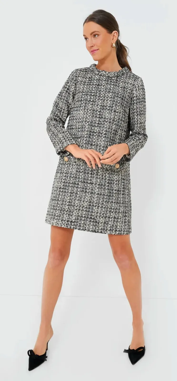Size XS Very good condition. One tiny area with a partially loose yarn. See image. Your favorite style, with a cooler update, now with sleeves. Named after the great style icon, Jackie O, the Jackie Dress is designed to make you feel confident and chic. The beauty is in the details—from the textured tweed fabric to the luxe braided trim and vintage-inspired buttons. The shift silhouette feels tailored but wears effortlessly, making it a closet icon. For everything from coffee catch-ups to client meetings, everyone needs a Jackie in her life. Crew neckline Bracelet length sleeves Braided detailing along neckline Faux pockets Faux front pockets with gold crest buttons Hidden back zip closure A-line shift silhouette Lined Textured tweed fabric Material: 100% Polyester (outer), 97% Polyester, 3% Spandex (lining) Machine wash cold Approximate flat measurements: Pit to pit- 17.5" Waist- 17.5" Length- 33.5"