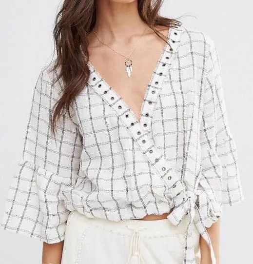 Lightweight woven fabric Wide V-neckline All-over print Wrap design Eyelet trim detail Wide-cut slee... Show more