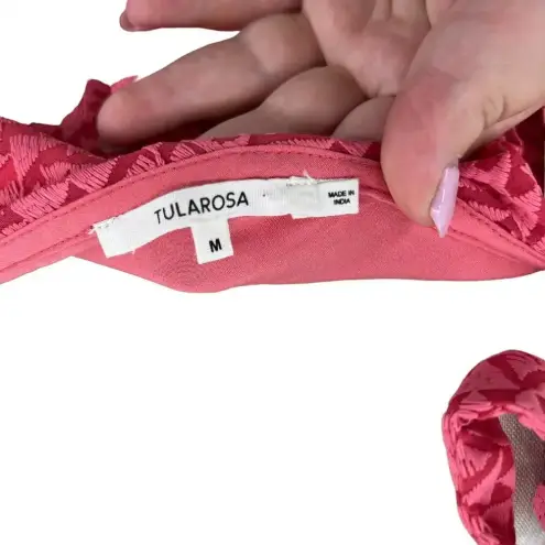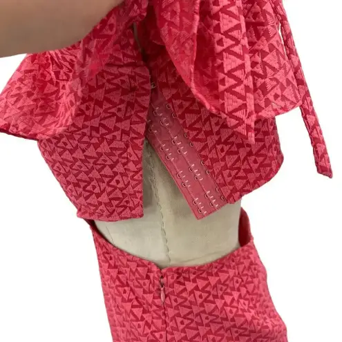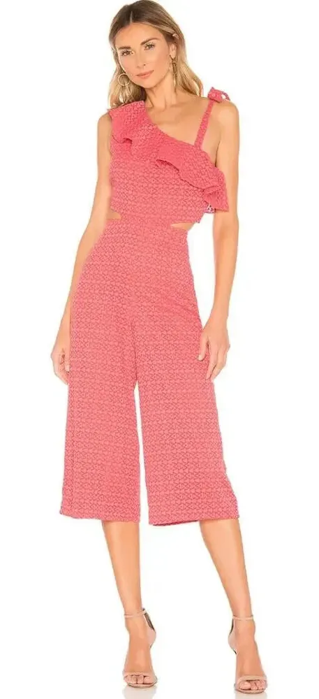Tularosa Belle Jumpsuit in Coral Pink Adjustable tie closure shoulder strap. Ruffled neckline. Side... Show more