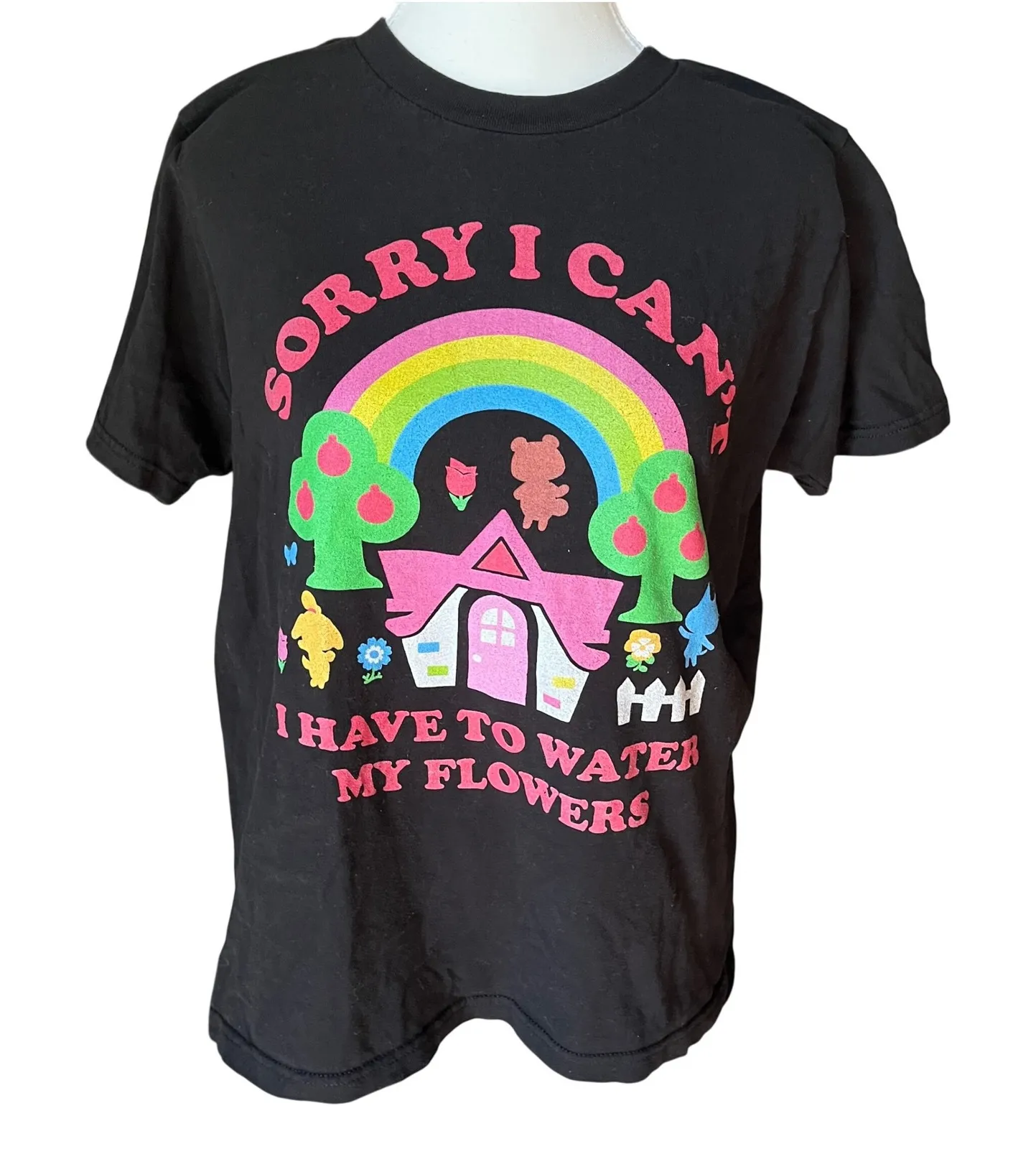 Nintendo Animal Crossing Graphic T-Shirt Sorry I Can't Black Tee No size tag but appears to fit like Medium - please refer to measurements to assure best fit Preowned/gently used Ships fast! Ships from a smoke free pet friendly home Keywords: Animal Crossing, Nintendo, Graphic Tee, T-Shirt, Black Shirt, Womens Shirt, Casual Top, Gaming Apparel, Video Game Shirt, Sorry I Can't, Water My Flowers, Cute Tee, Colorful Design, Officially Licensed