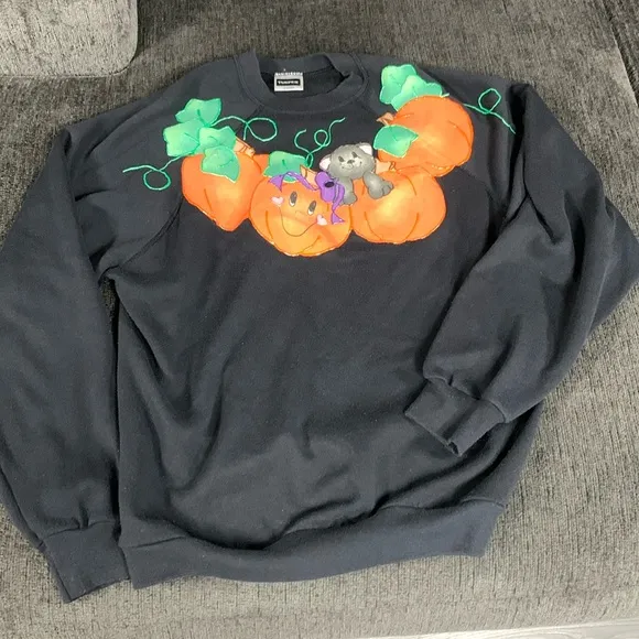 Vintage Halloween Puff Paint Sweatshirt with Cat & Pumpkins Size XL Orange - $38 - From Heather