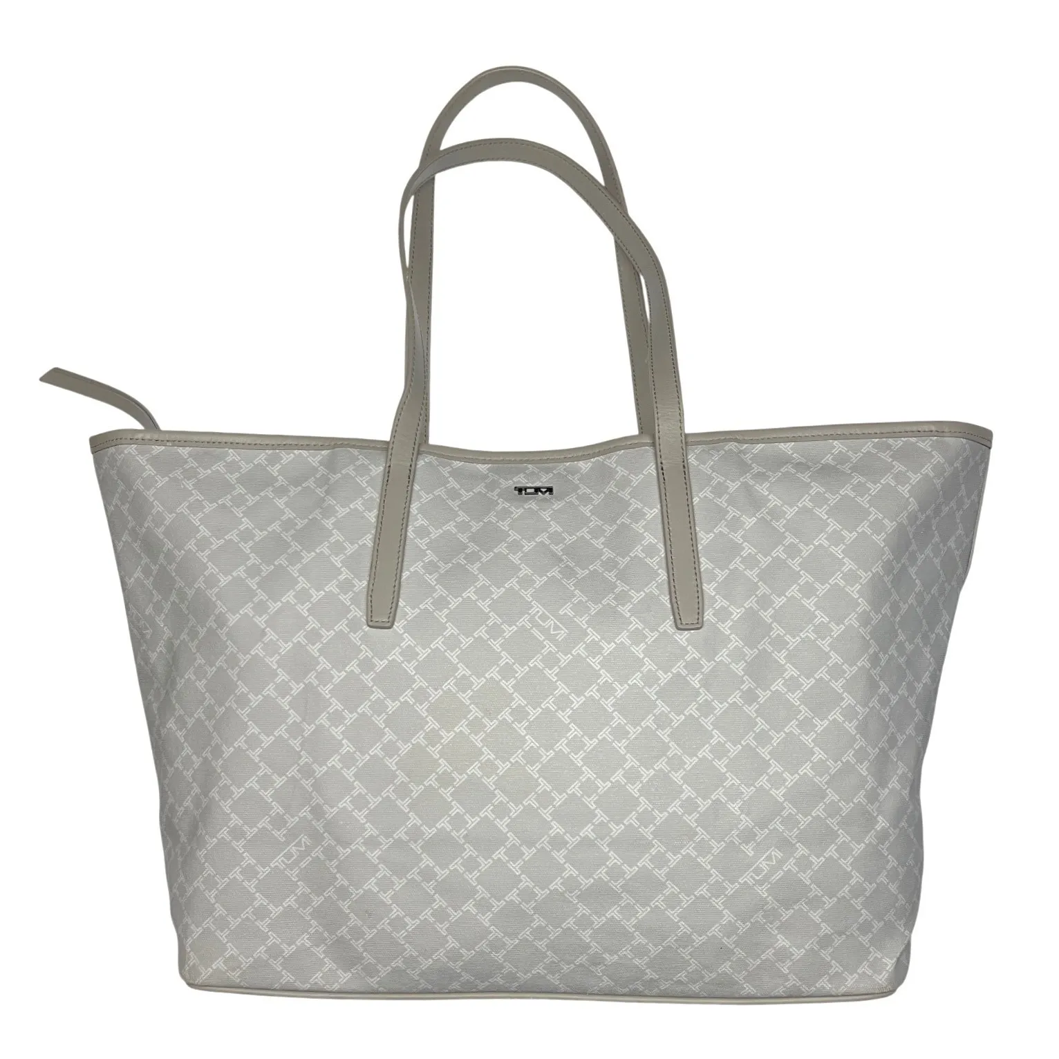 Brand: TUMI Style: Everyday Tote Size: Large Color: Gray exterior / Pink canvas interior Material: Coated canvas with leather handles Measurements: Length: 16" Height: 11" Width: 6" Features: Top zip closure Double leather handles Hidden magnetic phone pocket 3 interior pockets Luggage Sleeve Durable pink canvas lining Structured rectangular shape Condition: very good used condition — a couple of very small nicks on exterior; interior in excellent condition TUMI Everyday gray tote made from coated canvas with leather handles and zip-top closure. Clean interior with multiple pockets and hidden phone sleeve. Practical and polished for daily use or travel. I ship in 1–2 Business Days! tumi tote bag, tumi everyday tote, gray tote handbag, coated canvas tote, womens work tote, laptop tote bag, large zip top tote, leather handle tote, structured tote bag, everyday carry tote, womens travel tote, designer work bag, office tote handbag, minimalist tote bag, durable canvas tote, commuter tote bag, womens business tote, classic gray tote, premium tote bag, practical work bag, womens shoulder tote, upscale everyday tote, organized tote handbag, stylish utility tote, travel ready tote
