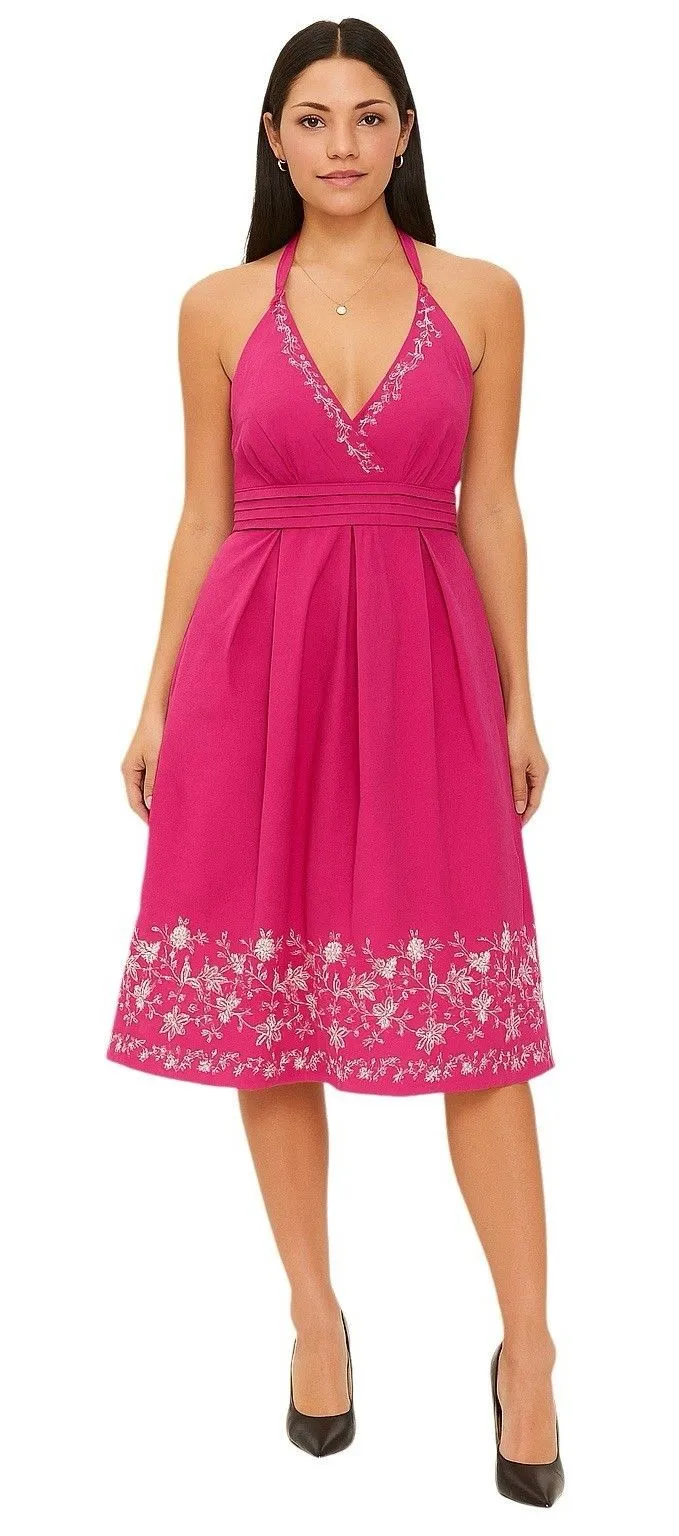 Tweeds woman 100% cotton tie halter neck dress midi length Smocked back , zip closure Lined , white floral embroidery Excellent condition Size 22w Flat measurements are 21 under arms across and 46 long