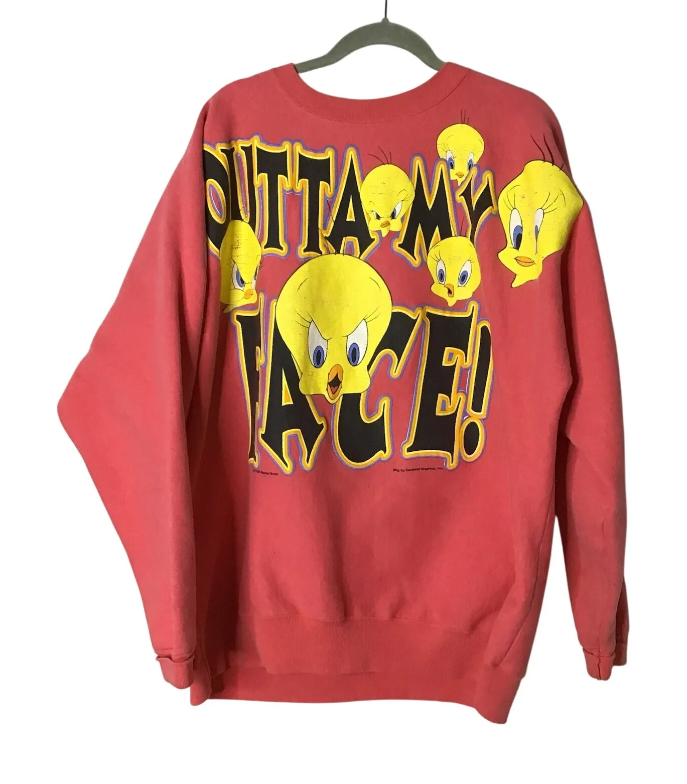 READ HAS SOME CRACKING Get ready to add some vintage charm to your wardrobe with this Tweety Bird Looney Tunes sweater. Featuring a coral, yellow, and red color palette, this pullover is perfect for casual or travel occasions during the fall, winter, or spring seasons. The crew neck and long sleeves provide comfort and warmth, while the polyester and cotton material make it easy to care for with machine washable instructions. This sweater is perfect for fans of the Tweety Bird character and comes in an XL size with a regular fit. The vintage design adds a touch of nostalgia to your outfit, making it a must-have for any Looney Tunes enthusiast. Made in the United States, this sweater is a great addition to any wardrobe.