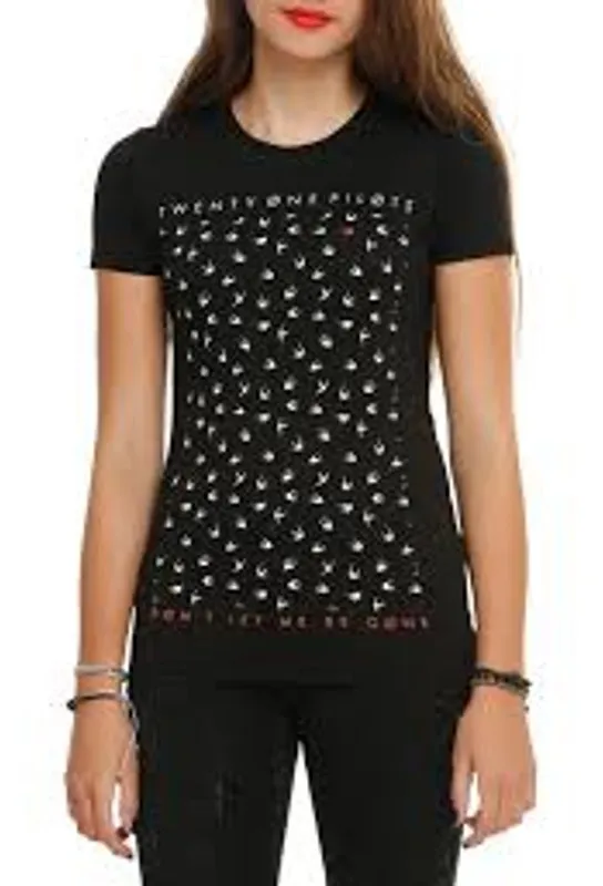 Twenty One Pilots tee Black with graphic See photo for bleach stain on back (you can cover it with a sharpie) Looks like it would fit size small imo No size tag tags: short sleeve, crew neck, rock me, hot topic, 111232 NPB
