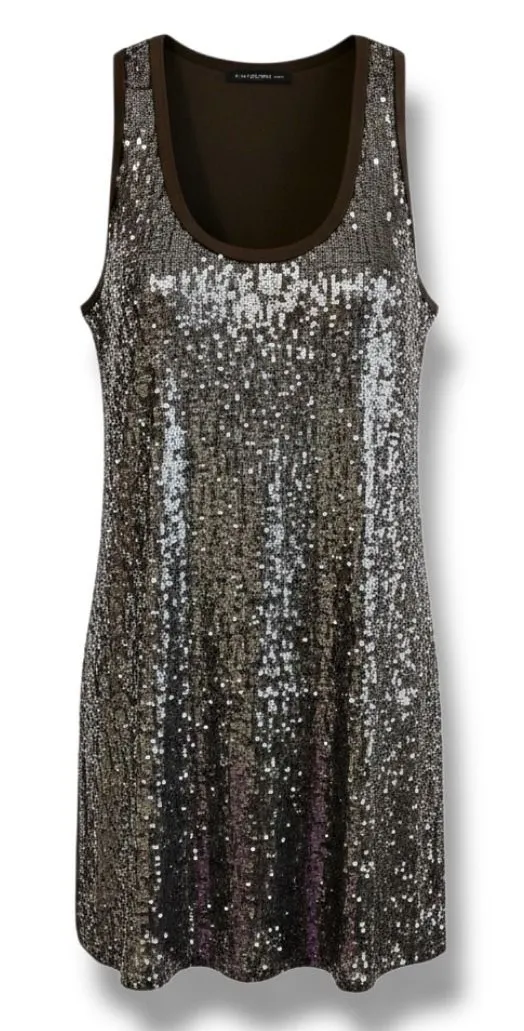 Twinset Simona Barbieri Sequin Star Sleeveless Dress | Size L Striking sleeveless dress by Twinset Simona Barbieri featuring an allover sequin front with double sequin star appliqués on the back for a bold statement finish. Scoop neckline, relaxed straight silhouette, and subtle stretch for comfort. Perfect for evening events, parties, holidays, or styled edgy with boots and a leather jacket. Condition: Very good preowned condition Color: Olive green-dark (with multicolor silver color sequins Size: L Made in Italy Fabric: • 95% viscose • 5% elastane Care: Hand wash only Approximate Measurements (laid flat): • Pit to pit: ~18" • Strap width: ~3" • Length (shoulder to hem): ~36" Relaxed fit with fluid drape. Please reference measurements for best twinset simona barbieri italian designer olive green sequin dress star applique party evening y2k style glam statement dress sleeveless artsy luxury euro chic holiday