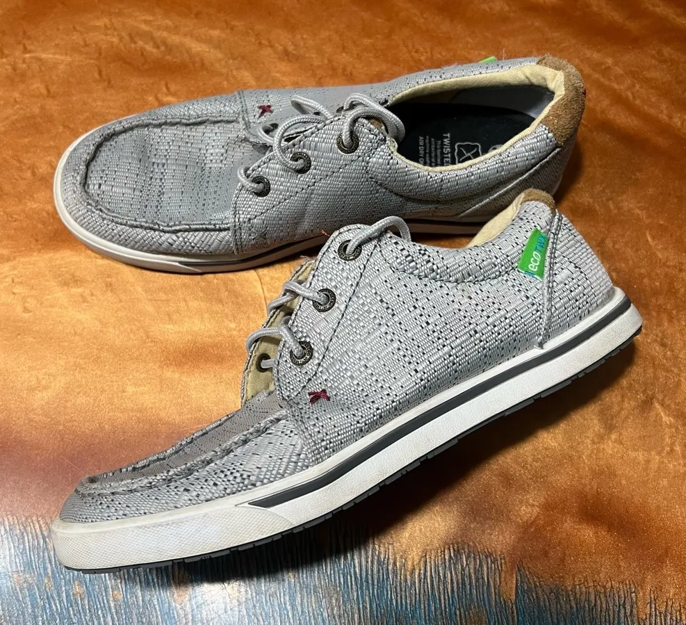 Brand: Twisted X x Hooey What: Casual moc-toe loper shoes Gender/Size: Womens Size 7.5 M (US) Color: Gray Model/Code: WHYC009 Upper/Outsole: Textile upper (ecoTWX) / Man-made outsole Features: Moc toe design; lace-up closure; lightweight casual comfort Footbed: Antibacterial and machine washable insoles (air dry only) Branding: HOOEY heel badge; Twisted X logo in footbed; ecoTWX side tag Outsole: Rubber with X-tread pattern for traction Country of Origin: Made in China (per interior tag) Notes: See photos for exact color and details; great everyday casual shoes.