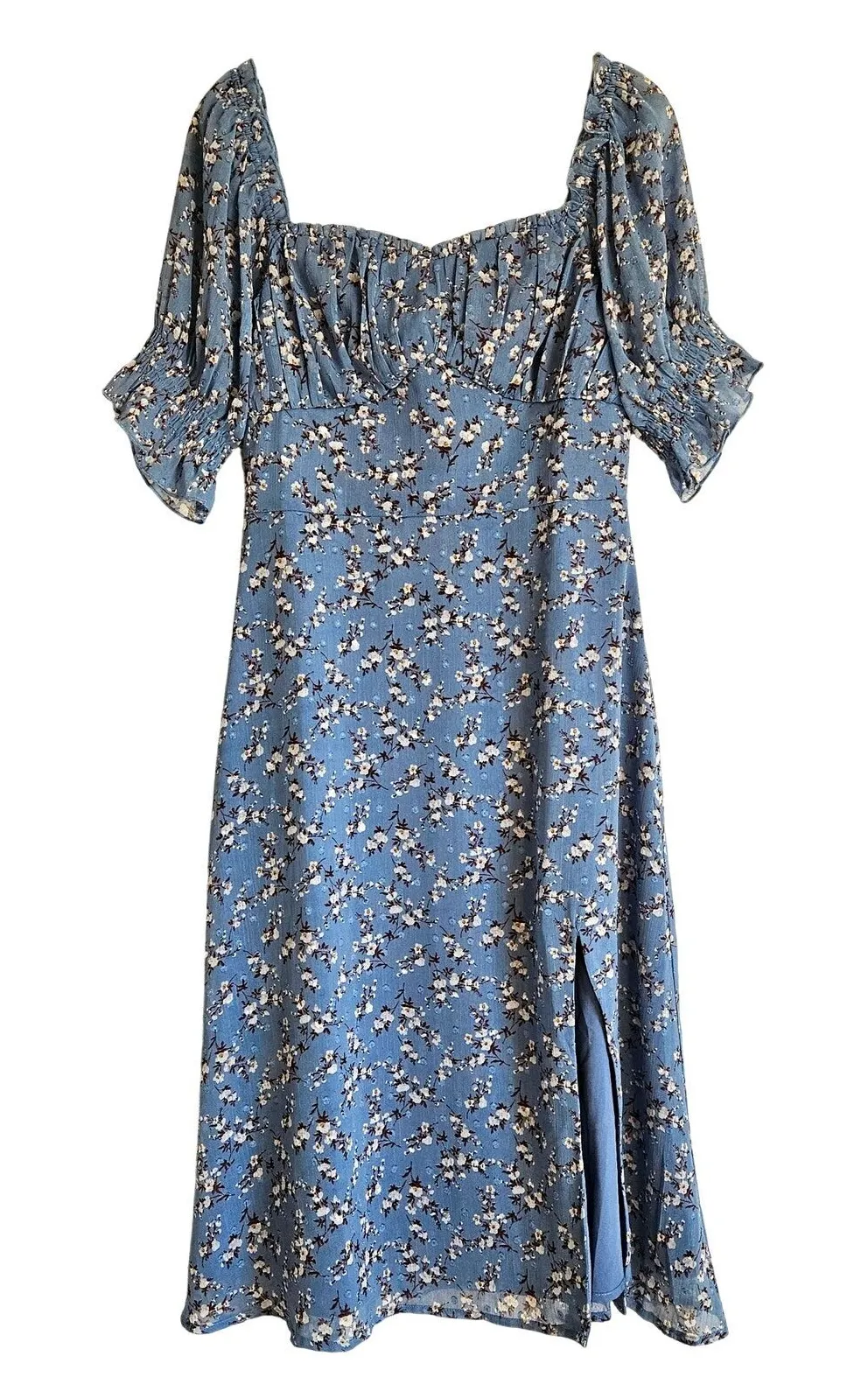 Stunning Two Sisters The Label Blue Floral Dress, perfect for any occasion! This off-the-shoulder midi dress features a delicate floral print on a soft blue fabric, with puffed sleeves and a flirty front slit. Lightly worn, in excellent condition, size US 4. Flowy and feminine, ideal for spring or summer events. Approximate Measurements: bust: 16" pit to pit flat across waist: 13.5" flat across length: 36" from shoulder to bottom hem Thank you for your interest! Please let me know if you have any questions. Check out my other listings and save on shipping when you bundle! Tags: wedding guest, event, cocktail, party, glam, night out, date night, formal, rehearsal dinner, ceremony, charity, Vegas, fancy, Bodycon, mini, designer, Spring, Summer, coquette, girlcore, boho, bohemian, silk, garden party, fairycore aesthetic, colorful, bright, floral