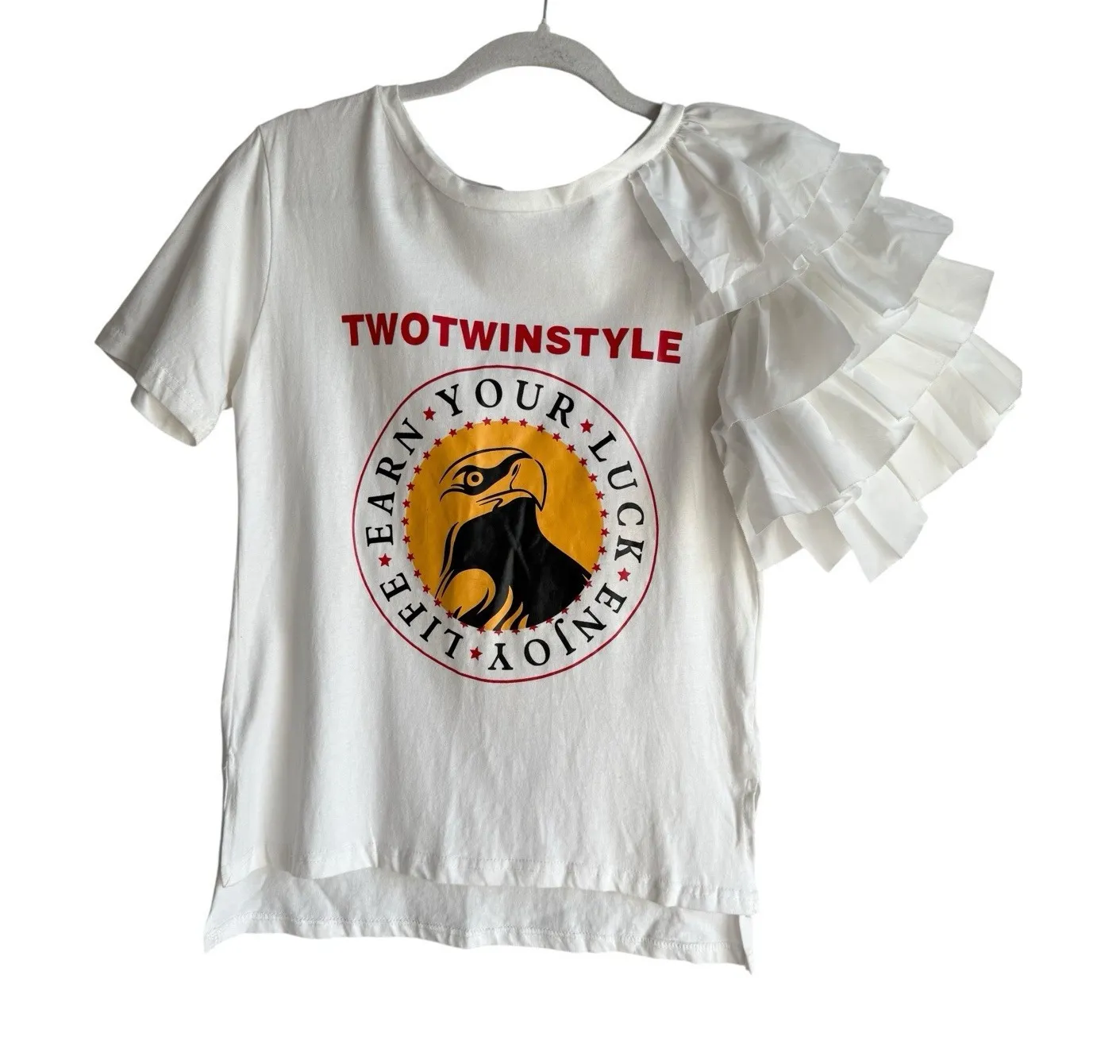 The Twotwinstyle Shirt is a stylish and versatile top for women in size small, featuring a classic crew neck and ruffle sleeves for a statement fashion look. Made from a comfortable and breathable blend of spandex and cotton, this white ivory shirt is perfect for various occasions. Length 23" Bust 18" Sleeves 8" In great preowned condition