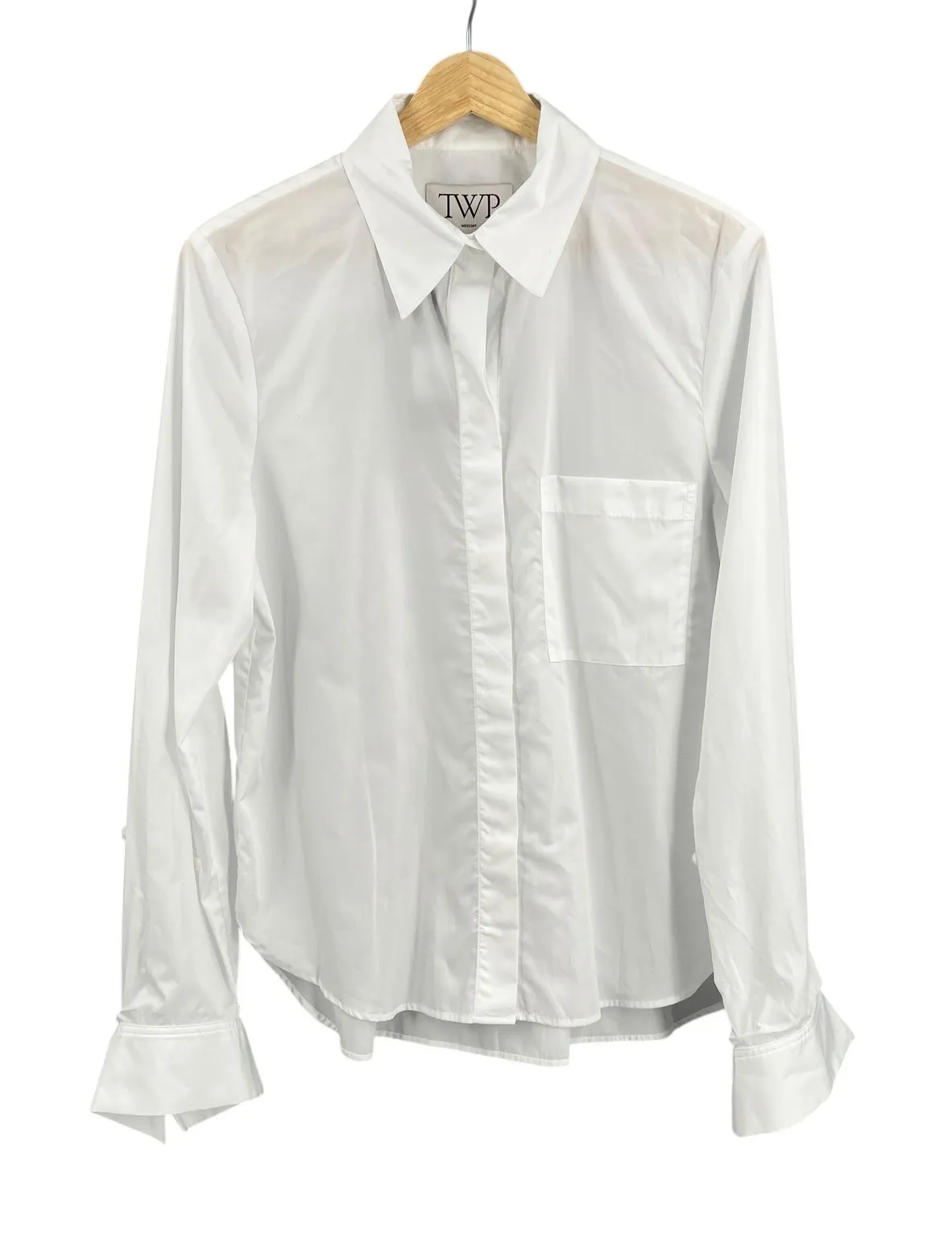 This TWP (Trish Wescoat Pound) "Boyfriend" shirt is crafted from 100% crisp white cotton poplin and features a classic button-down front, chest pocket, long sleeves with convertible double-button cuffs, and a subtle "JH" embroidered monogram on one cuff. Made in the USA. New with tags. Approx. measurements: 18.5″ armpit to armpit, 26″ front length, 27.5″ back length, 25″ sleeve. Condition: New with tags. Retail $390. Keywords: TWP, boyfriend shirt, classic, crisp, minimalist, tailored, workwear, smart casual, versatile, button up, designer, preppy