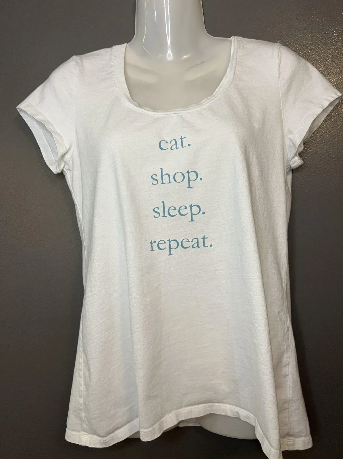 Pre-owned with light overall wash wear. Fabric, seams, and graphics are intact; interior size and care tags present, no original retail tags. Brand: tyler böe Style: Womens short sleeve scoop neck basic T-shirt with front quote graphic. Color: White with light blue text reading "eat. shop. sleep. repeat." on the front. Back features a blue dragonfly graphic with tyler böe logo and "annapolis, md | newport, ri" text. Size: Womens Small (S) as shown on the tag. Material: 100% cotton; Made in China. Care: Machine wash cold with like colors, delicate cycle, do not bleach, reshape and lay flat to dry or gentle tumble dry, cool iron if needed; RN 93093. Details: Lightweight regular-fit solid white tee with quote theme, short sleeves, and casual everyday style suitable for all seasons. PTP 19" Length 25" bin 109 2532