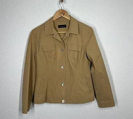 Excellent used condition with no flaws Size/ material tag has been removed- best fits a small, material is a stretch cotton with polyester lining Khaki/ tan color Button Front Length 21” Underarm to underarm 18”