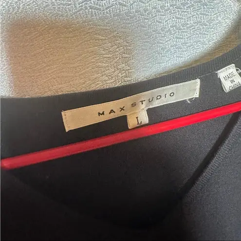 This sleek black sweater from Max Studio features a fitted silhouette has bell sleeves with x on fro... Show more