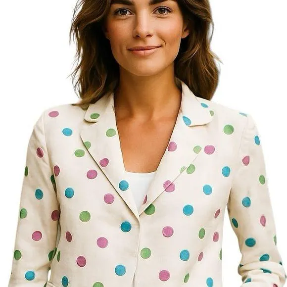 BIELLA COLLEZIONI MARIA LUISA B CROP POLKADOT WHITE PINK BLUE BLAZER JACKET Size: 42= US6 Pit to pit approx 20” Length 21” Sleeves measured from underneath pit to split sleeve cuffs approx 14” Single button front closure Has two small vent splits in the rear. Lined Made in Italy Ramie linen The blue dots are shimmery metallic. Excellent condition! High end designer Italian summer blazer.