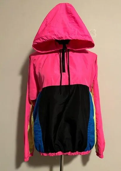 Neon windbreaker with drawstring hood - there is a few small spots on the hood as shown in photos -... Show more