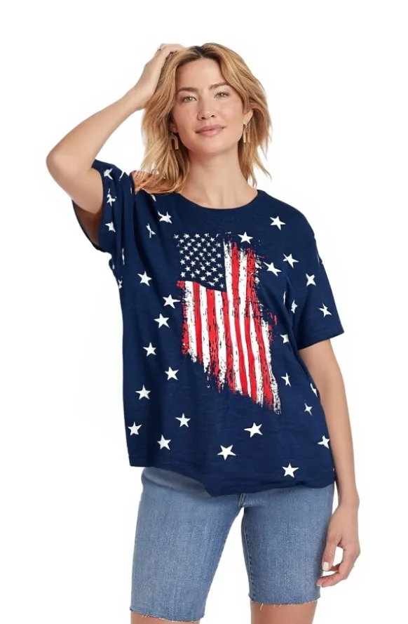 Americana-style distressed flag tee featuring bold stars and vibrant blue hues. Casual, comfy, and... Show more