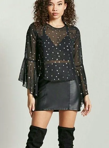 Details A sheer chiffon top featuring allover metallic star-shaped appliques, a boat neck, back keyh... Show more