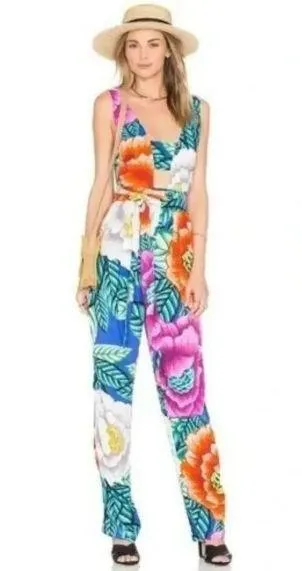 A stunning bold flora blue print jumpsuit with front cutout, pockets, and wrap around tie and side zip Ties in back Sold on Revolve Size 6 100% Rayon Measurements~~ 14" Pit to pit 60" Length 30" Inseam Excellent condition, no flaws