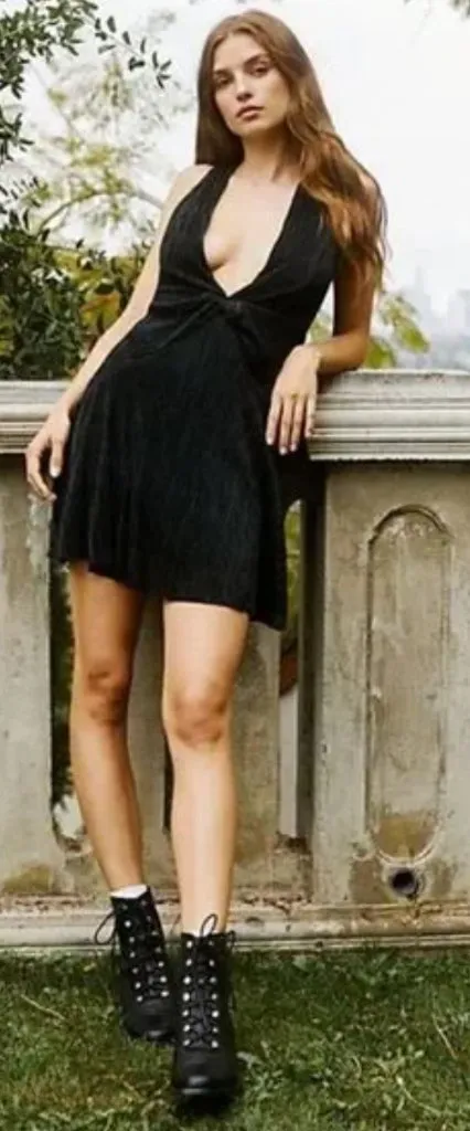 . Deep V-neck Sleeveless Deep scoop back Seamed waist Concealed side zip closure Partial skirt overl... Show more