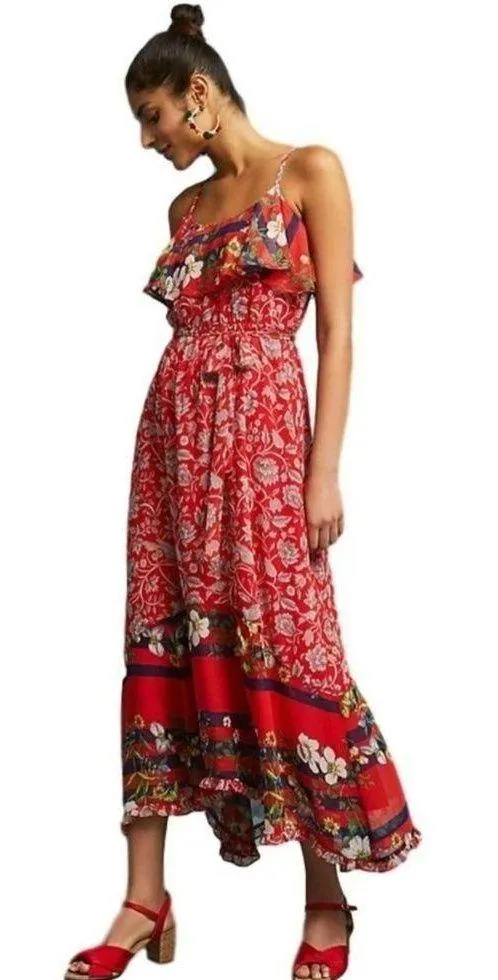 Anthropologie ONE SEPTEMBER Zuri Floral Bird Print Maxi Dress Red Navy SZ XS Elastic waist Fully lin... Show more