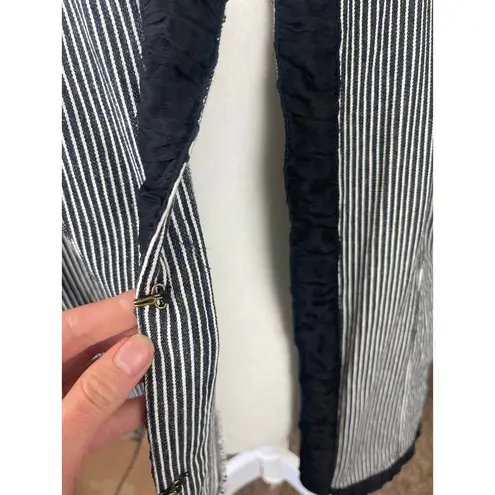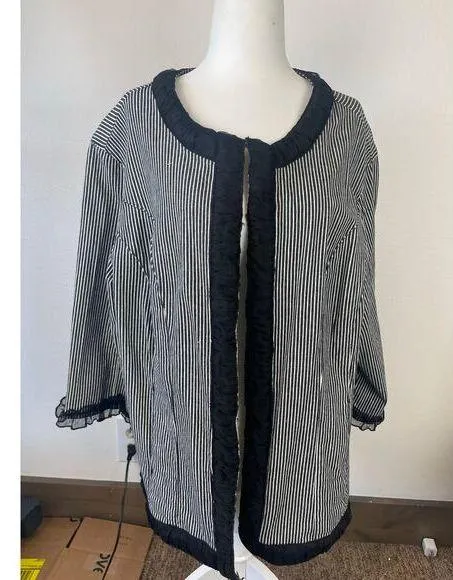 AMI Vintage Blazer, Overcoat, Light Jacket, Similar to a denim material. Eye Hook closures 3/4 Sleeve Black with white stripes, lace ruffle details on hems Women's size 1X Two pockets Measurements (Flat Lay): Pit to pit (when buttoned): 24" Sleeve: 17" Shoulder to Hem: 24"