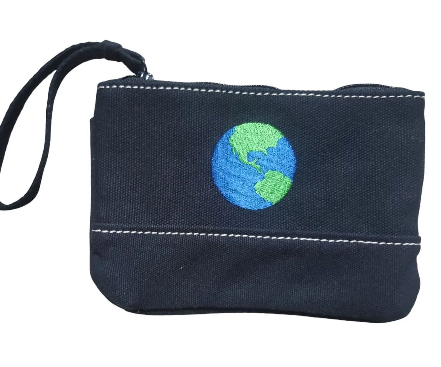 Lands End Canvas Pouch Makeup Toiletry Bag Kit Black Embroidered Earth 6"x4".