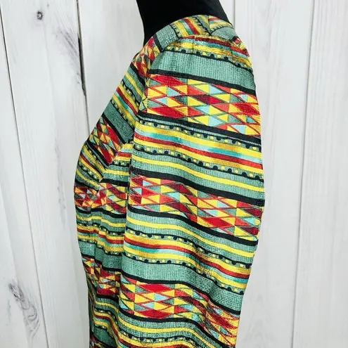 . This jacket has 6 front buttons and is in a beautiful teal, red and gold geometric pattern. It doe... Show more