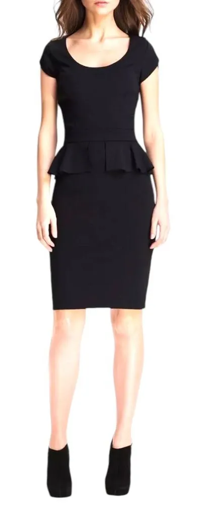 Rebecca Taylor Peplum Sheath Dress A scoop neckline and cap sleeves gracefully begin a stretchy sheath dress with a flattering peplum-waisted pencil skirt. - Size: 4 - Color: Black - Scoop neckline - Cap sleeves - Peplum waist - Exposed back-zip closure. - Partially lined. - Polyester/rayon/spandex - Dry clean - Stock photos are shown for fit purposes only. - Please review photos as they are apart of the description. - Preowned Condition. No known flaws/minimal pilling/fading. - See photos for approximate measurements - No Modeling/Holds/Trades Please use offer button to negotiate. Thanks!