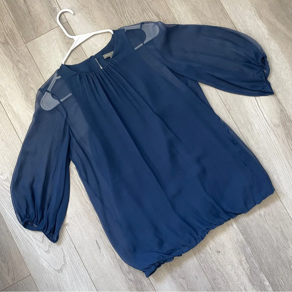 Vince Silk Pleated Sheer Blouse in the color Blue. Round neckline with back button closure and keyho... Show more