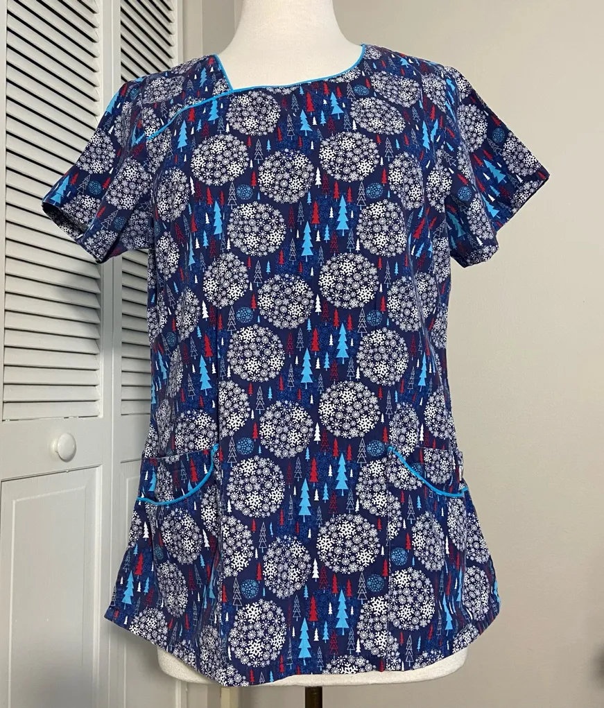 Women’s UA Uniform Advantage Scrub Top Snow/ Holiday Winter Theme Navy Cool Tones Turquoise White Red All over navy background with snowflakes orbs trees 2 front lower patch pockets Asymmetrical neckline Turquoise piping details Approximate flat lay measurements: 26.5 inch length 21 inch chest width (pit to pit) Condition is as pictured; some minor fading in areas Thank you for your purchase! Items will be shipped promptly as I strive to provide only 5 star service!