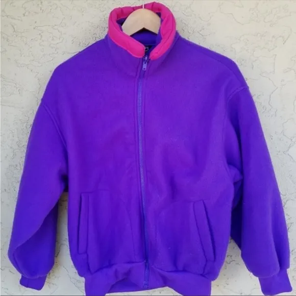 Purple pink neon fleece zip up jacket with collar 80s 90s oversized jacket Side pockets Ribbed cuff... Show more