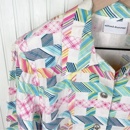 Alfred Dunner Linen Mixed Print Patchwork Jacket White with multicolor mixed plaid print quilt design Button front Collared Long sleeves 55% Linen, 45% Rayon Size 10 Deadstock; new with tags May have some minor markings from storage Approximate measurements: Pit to pit: 21” Length from shoulder: 25” Sleeves: 24” tags: retro, 2000s, y2k, 90s, patchwork, cottagecore, cottage, shabby chic, mixed print, plaid, quilted, linen, summer, coastal grandma, eclectic