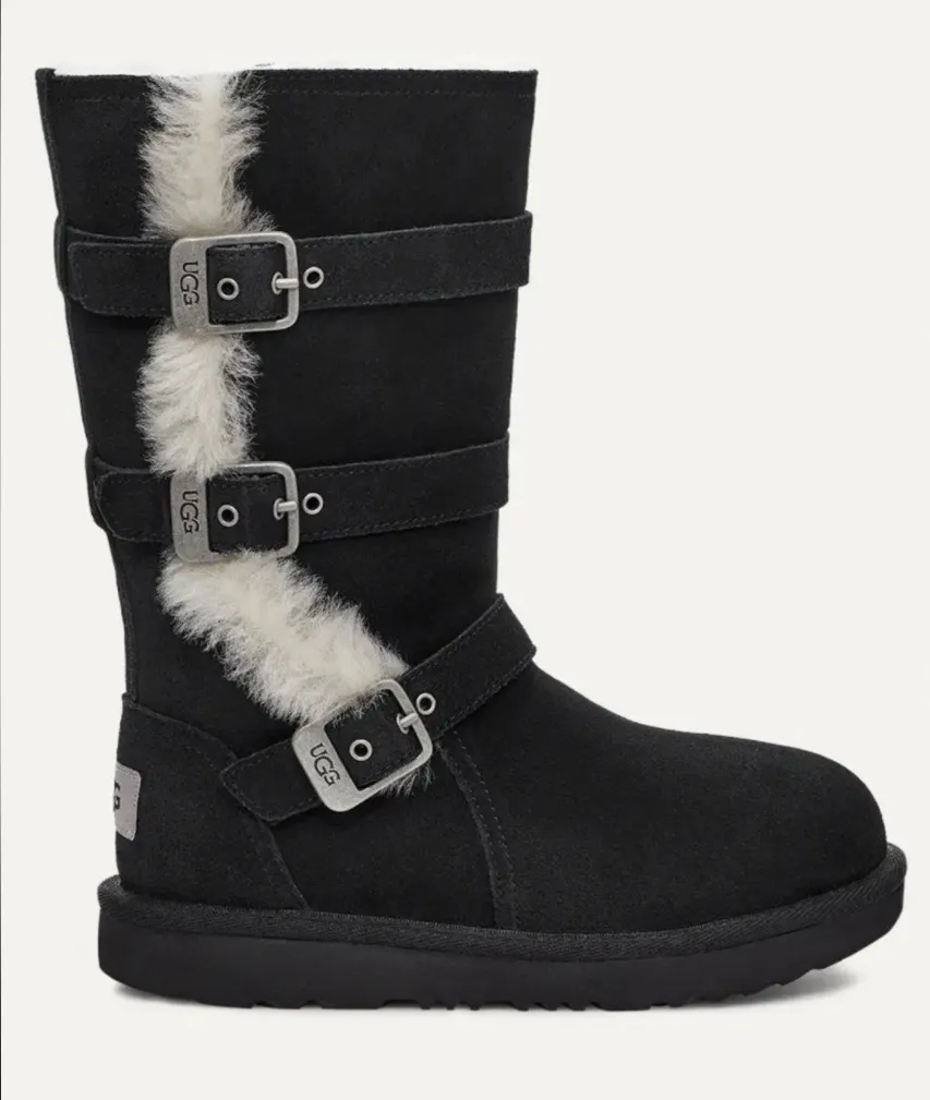 Stylish UGG boots with buckle accents. Black exterior with cream shearling trim. Ideal for winter we... Show more