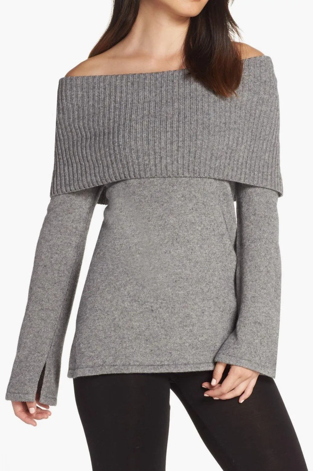 Cozy Grey off shoulder UGG sweater with ribbed knit collar and flowy sleeves. This sweater is long... Show more